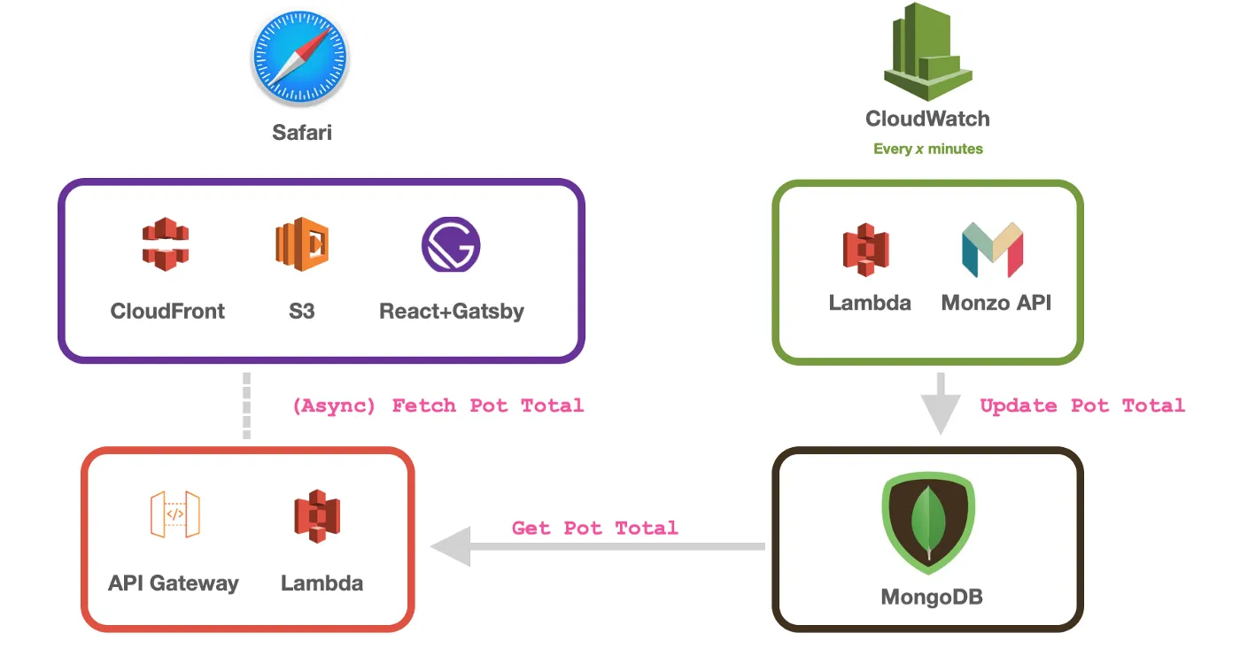 The app loads and then fetches the amount via AWS API Gateway which calls Lambda and reads the stored pot amount from MongoDB. And looks a bit like this:
